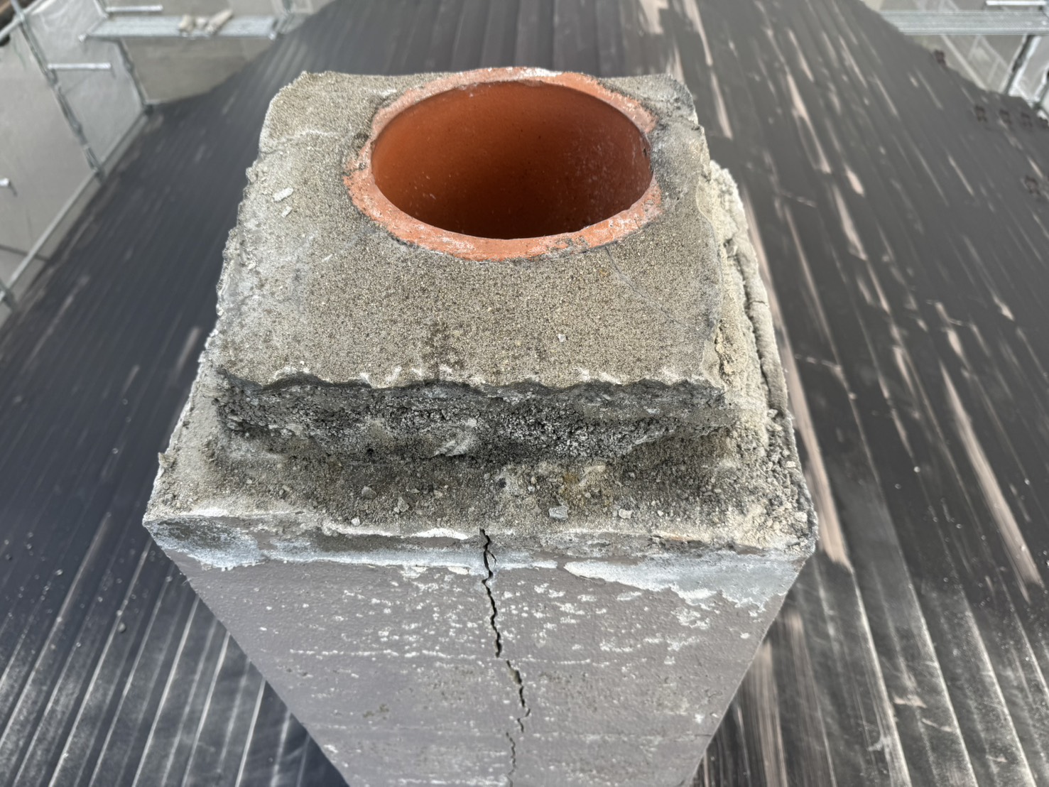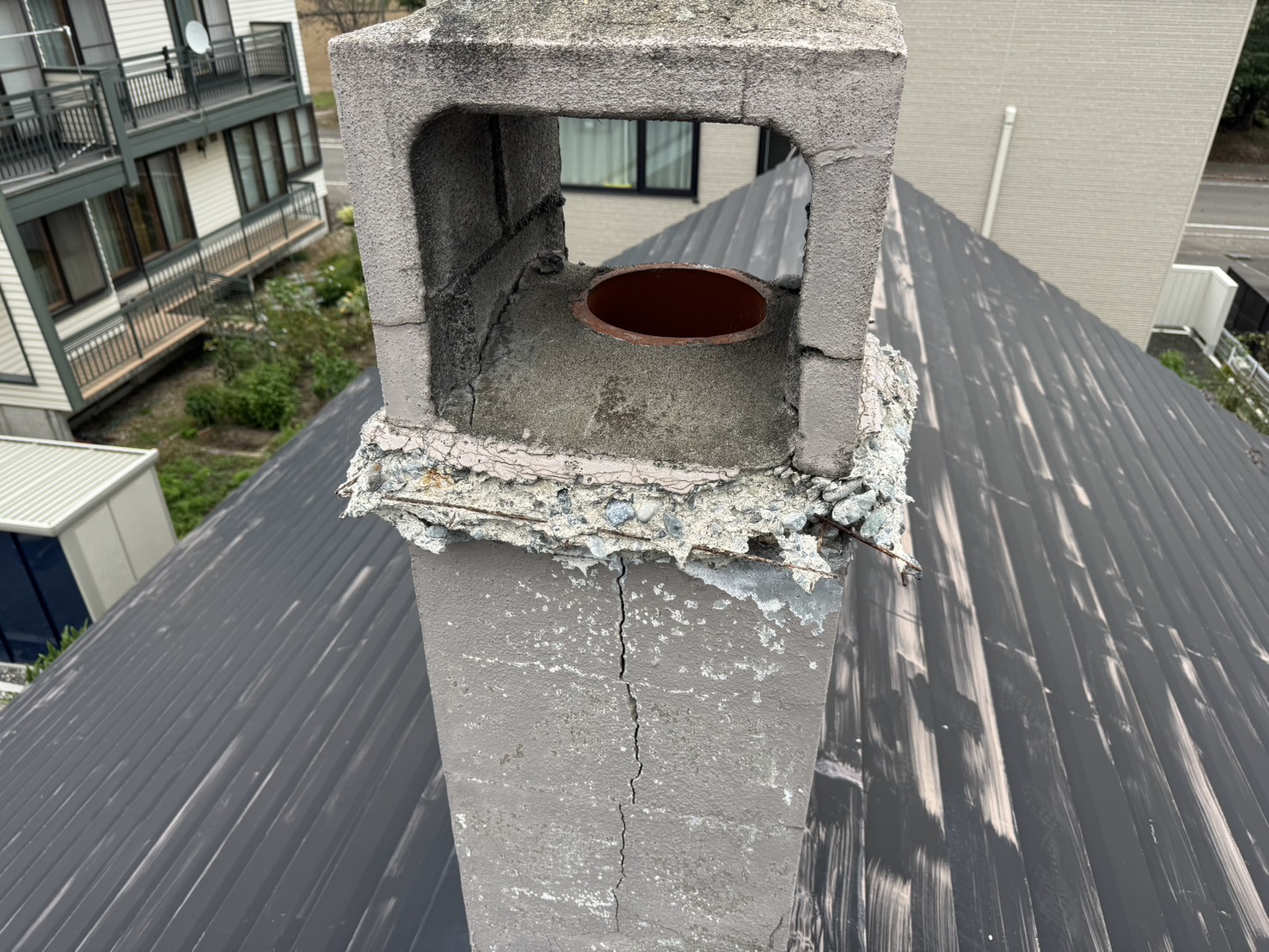 煙突が今にも崩れそうだったので解体しトタンを巻いています